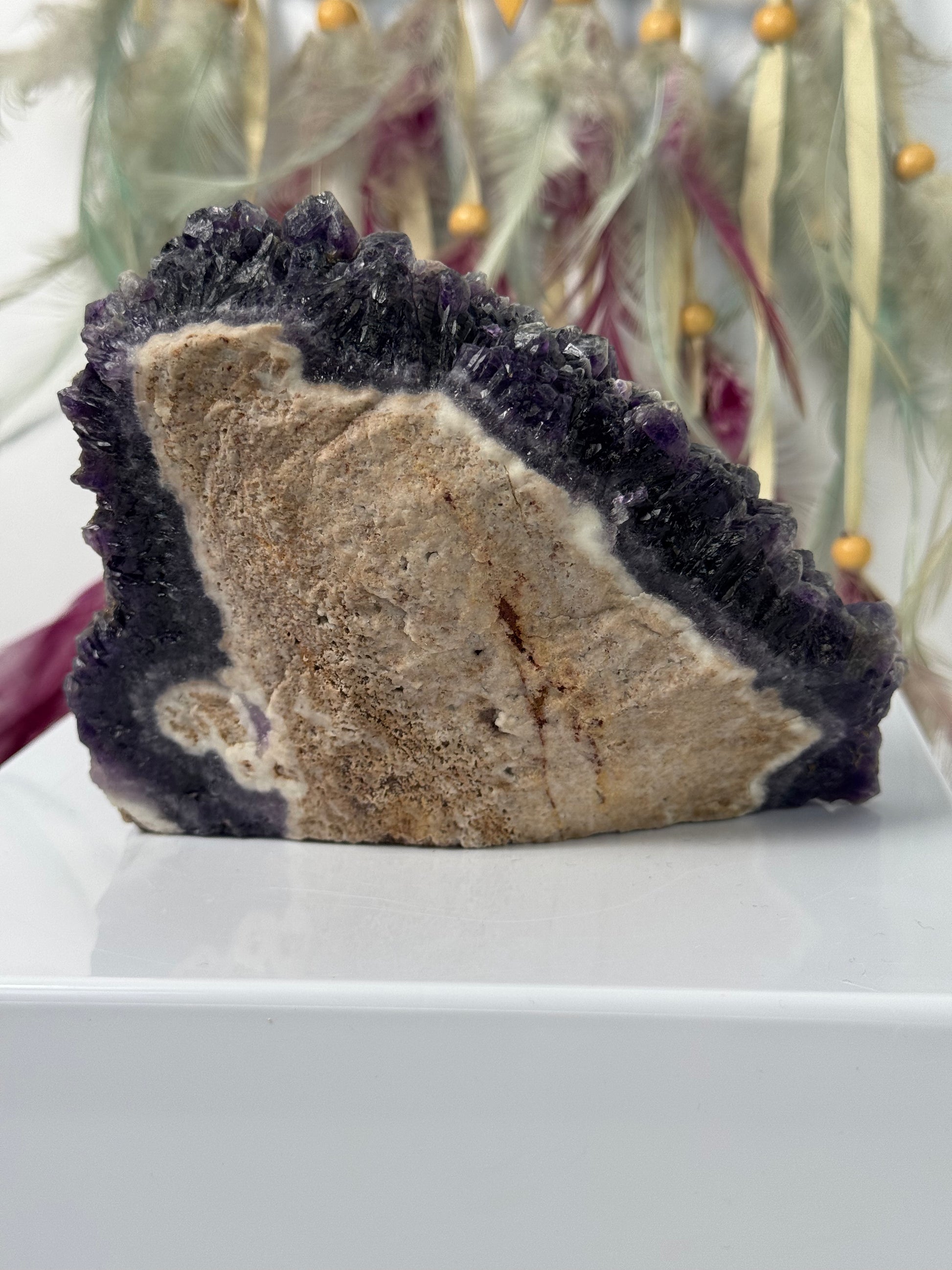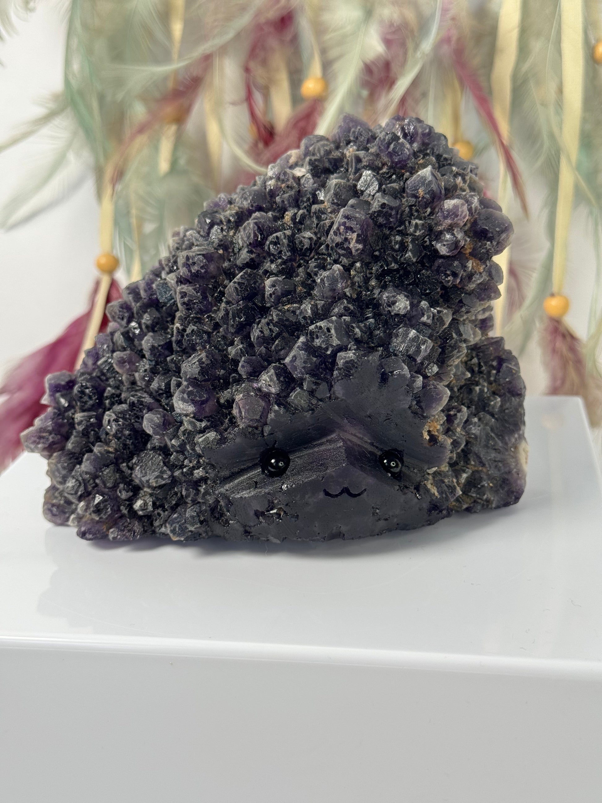 Dit vrolijke Calciet pupke straalt energie en positiviteit uit. Calciet werkt zuiverend en versterkend, en brengt helderheid in huis. De paarse kleur is geverfd, wat het stuk een extra speels en kleurrijk karakter geeft.Â