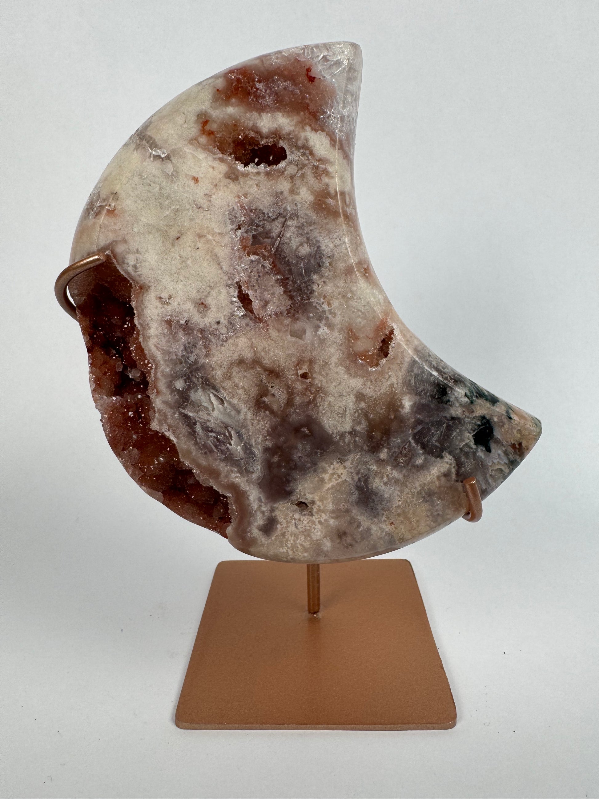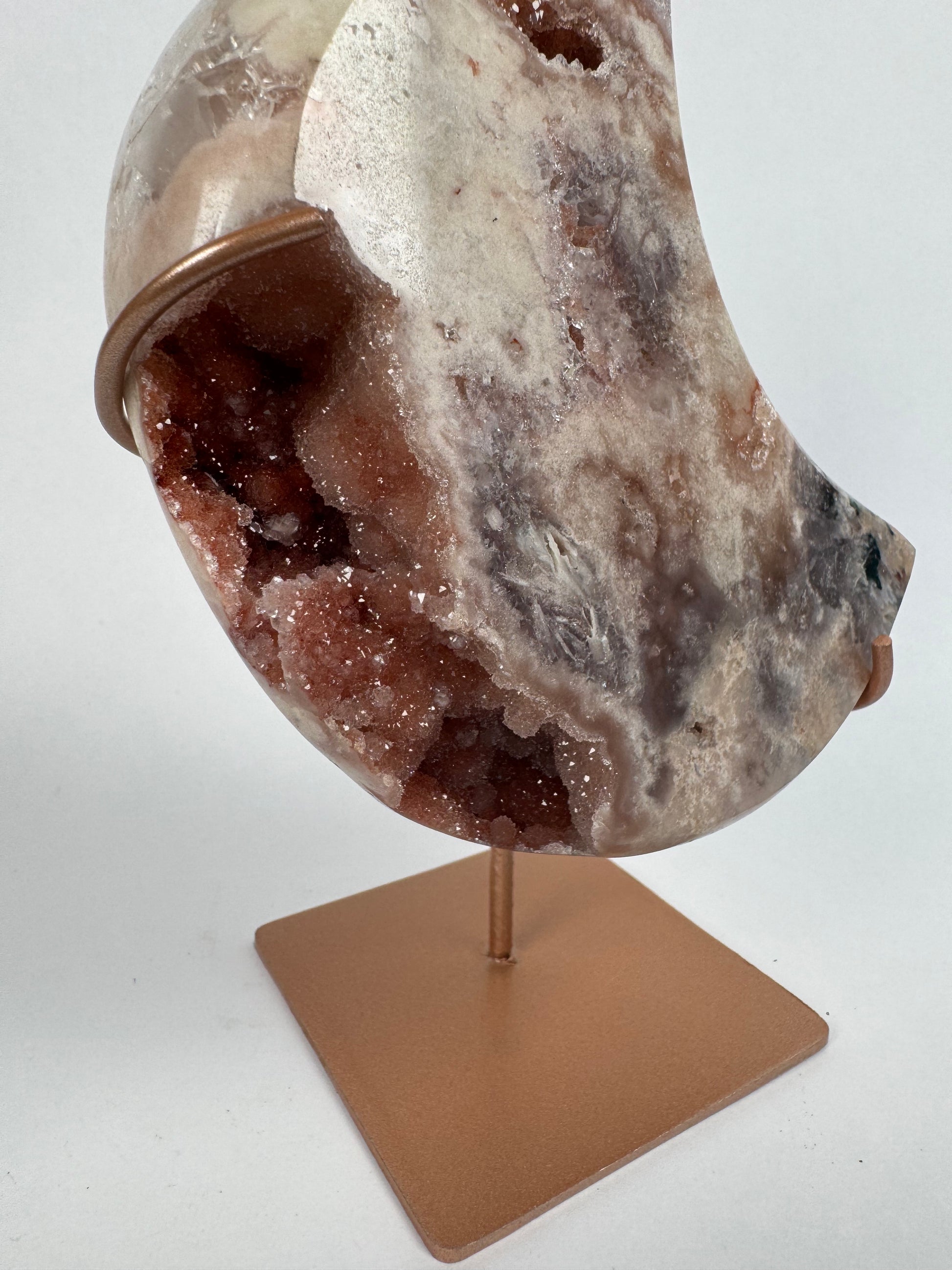 Deze maanvormige edelsteen op standaard is een uniek decoratiestuk én krachtig symbool van intuïtie en balans. De maan staat voor vernieuwing en innerlijke wijsheid, terwijl de edelsteen haar eigen energie toevoegt. Perfect als spirituele blikvanger in huis, praktijkruimte of op je altaar.