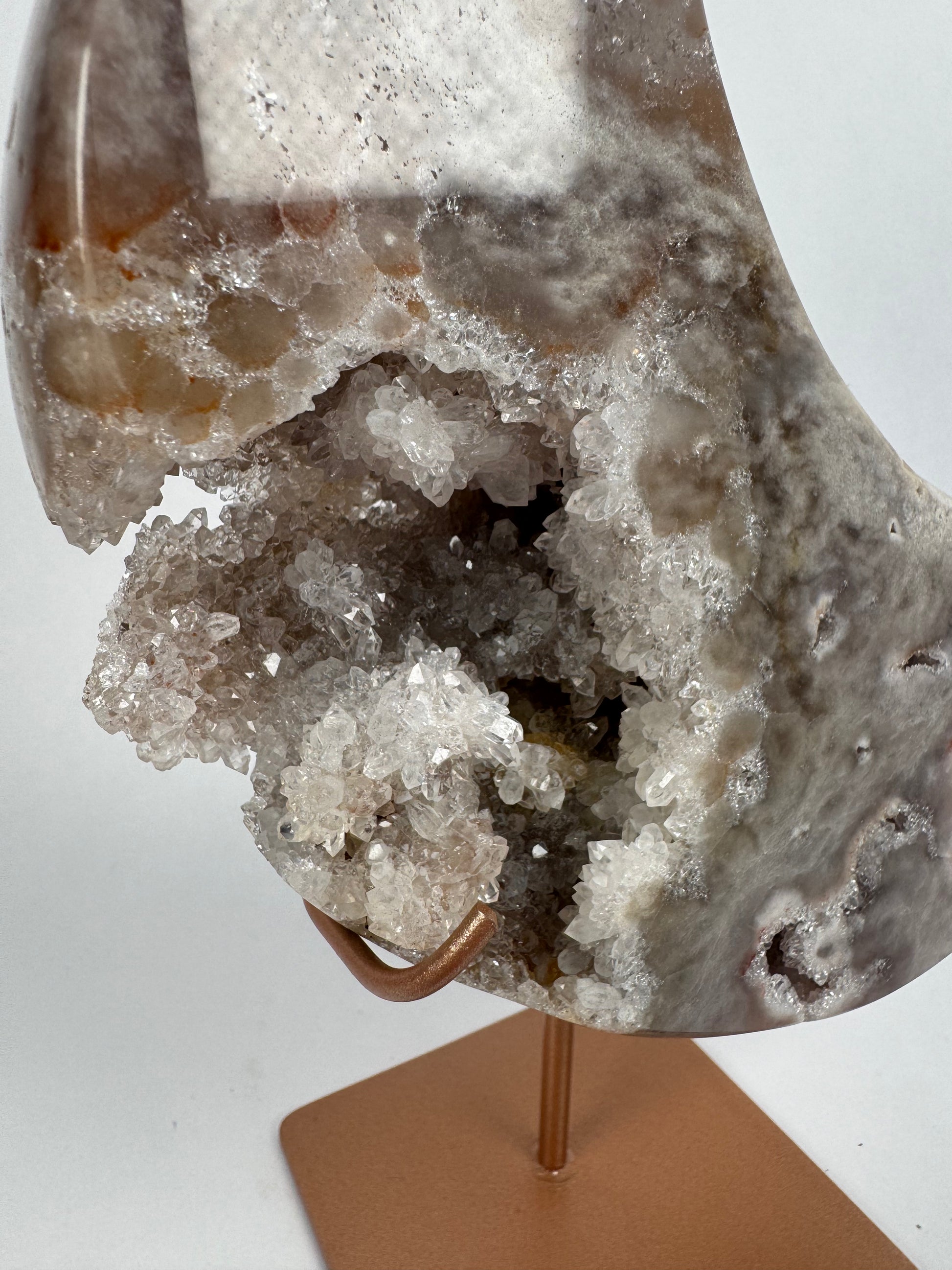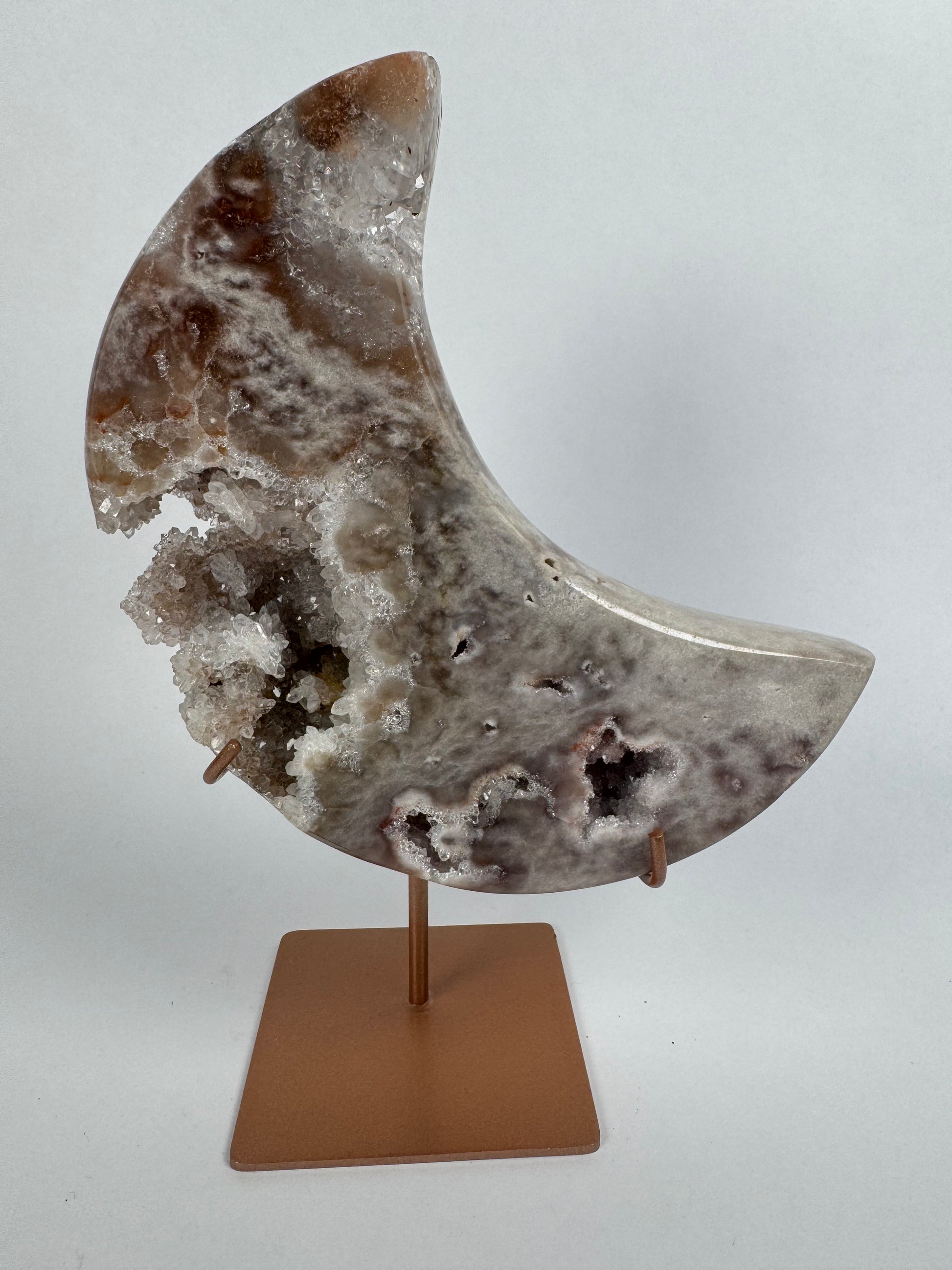 Deze maanvormige edelsteen op standaard is een uniek decoratiestuk én krachtig symbool van intuïtie en balans. De maan staat voor vernieuwing en innerlijke wijsheid, terwijl de edelsteen haar eigen energie toevoegt. Perfect als spirituele blikvanger in huis, praktijkruimte of op je altaar.